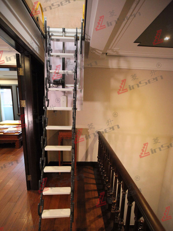 1、封锁→链接→携带配件上楼→吊(举)塞入洞口→固定楼梯→调整限位螺丝(切记)放下楼梯观察踏板在水平或者上楼梯放下略高时把螺丝顶到摇壁,然后锁紧螺帽。